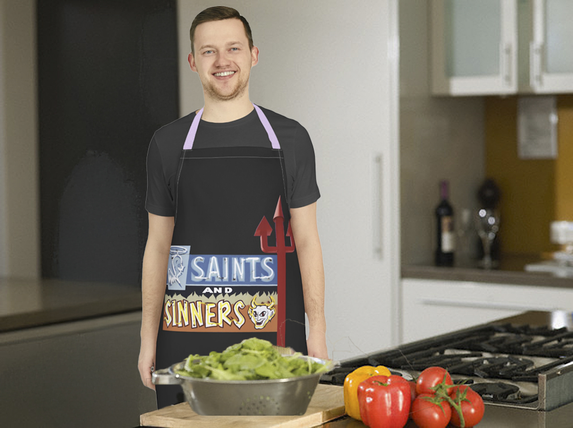 Cooking Apron with a Saints and Sinners Design, perfect as a gift for chefs or as kitchen decor. Ideal for naughty chefs looking to add some fun to their cooking routine. Relevant for holidays like Christmas, birthdays, and housewarming parties.