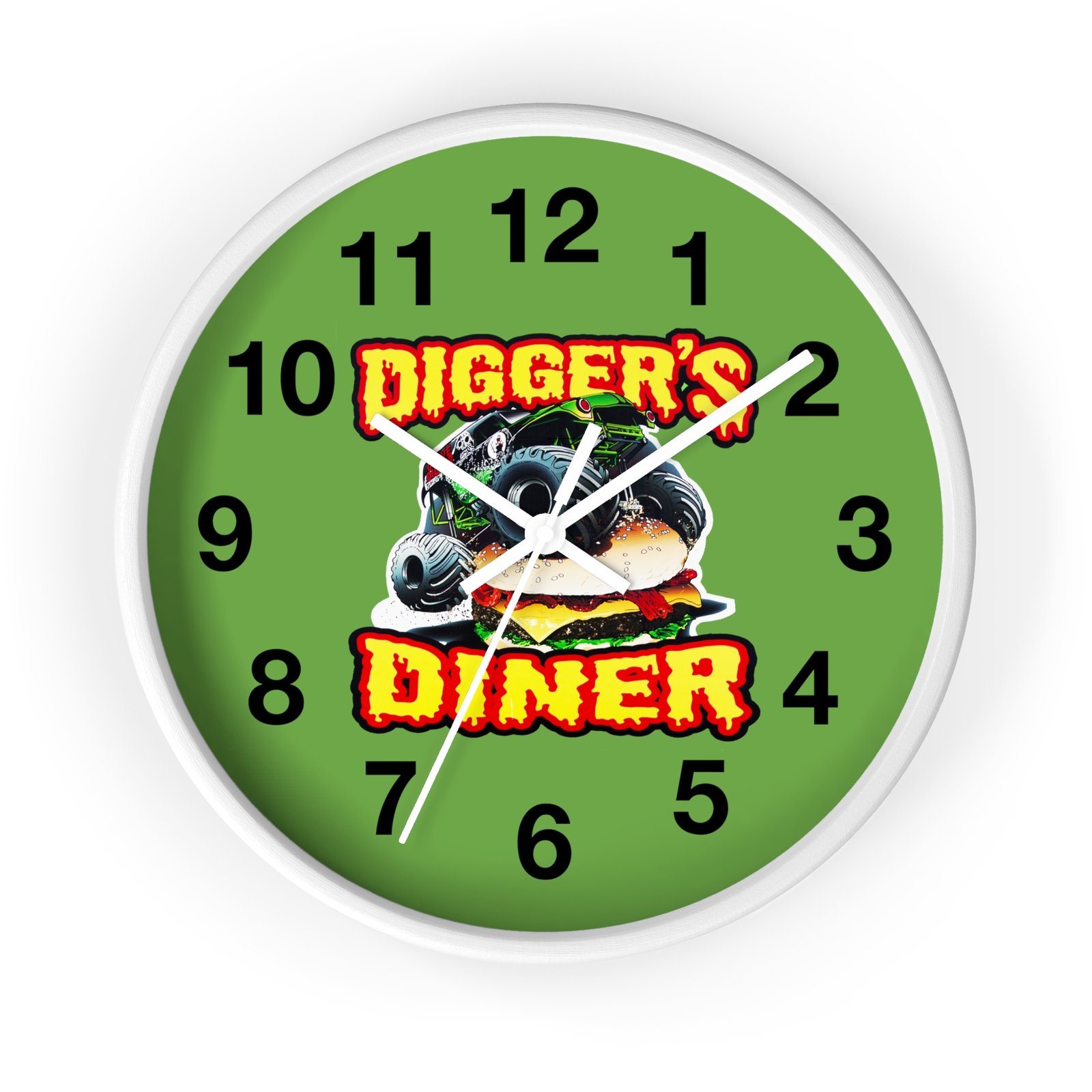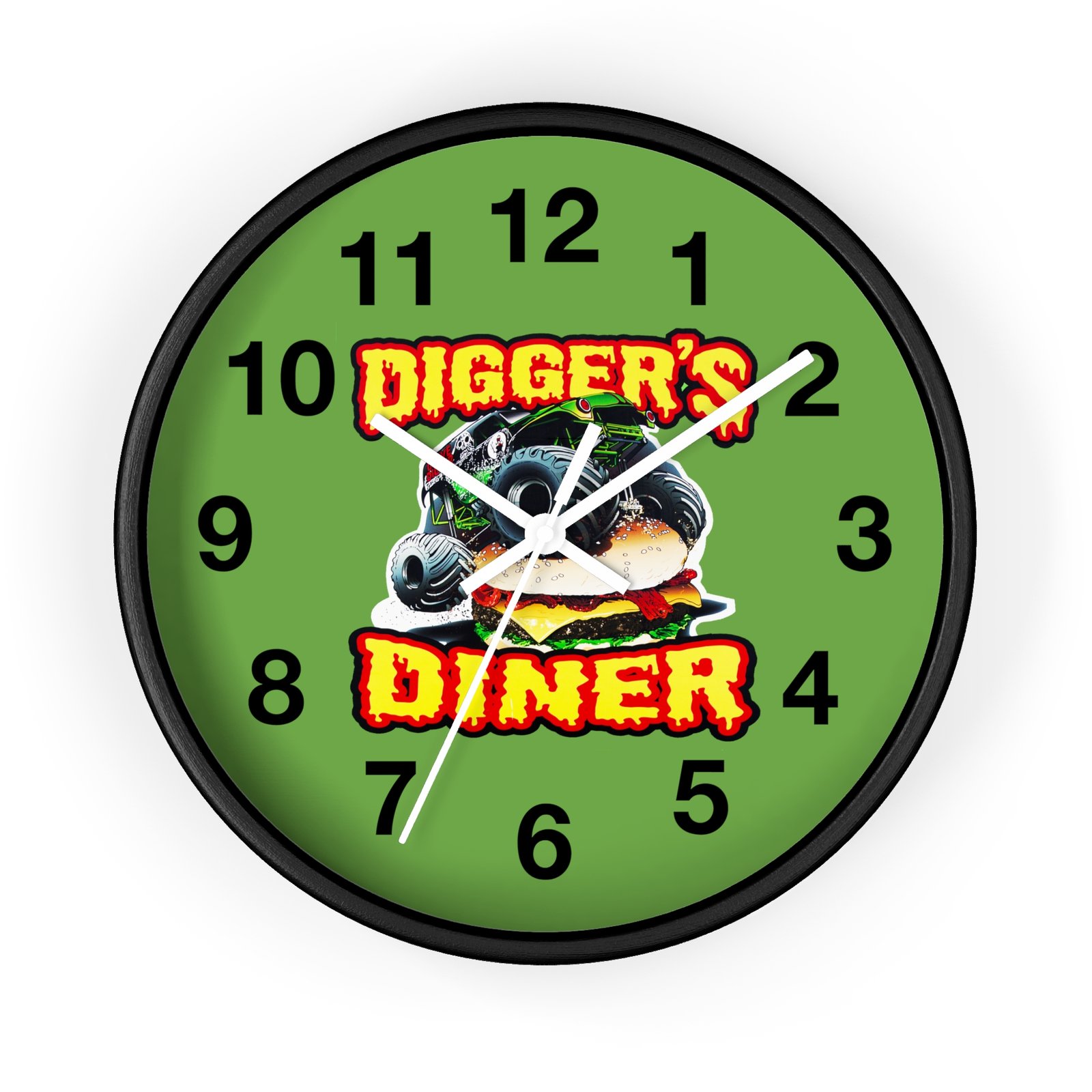 Digger’s Diner Wall Clock, Kitchen Decor, Unique Monster Truck Clock