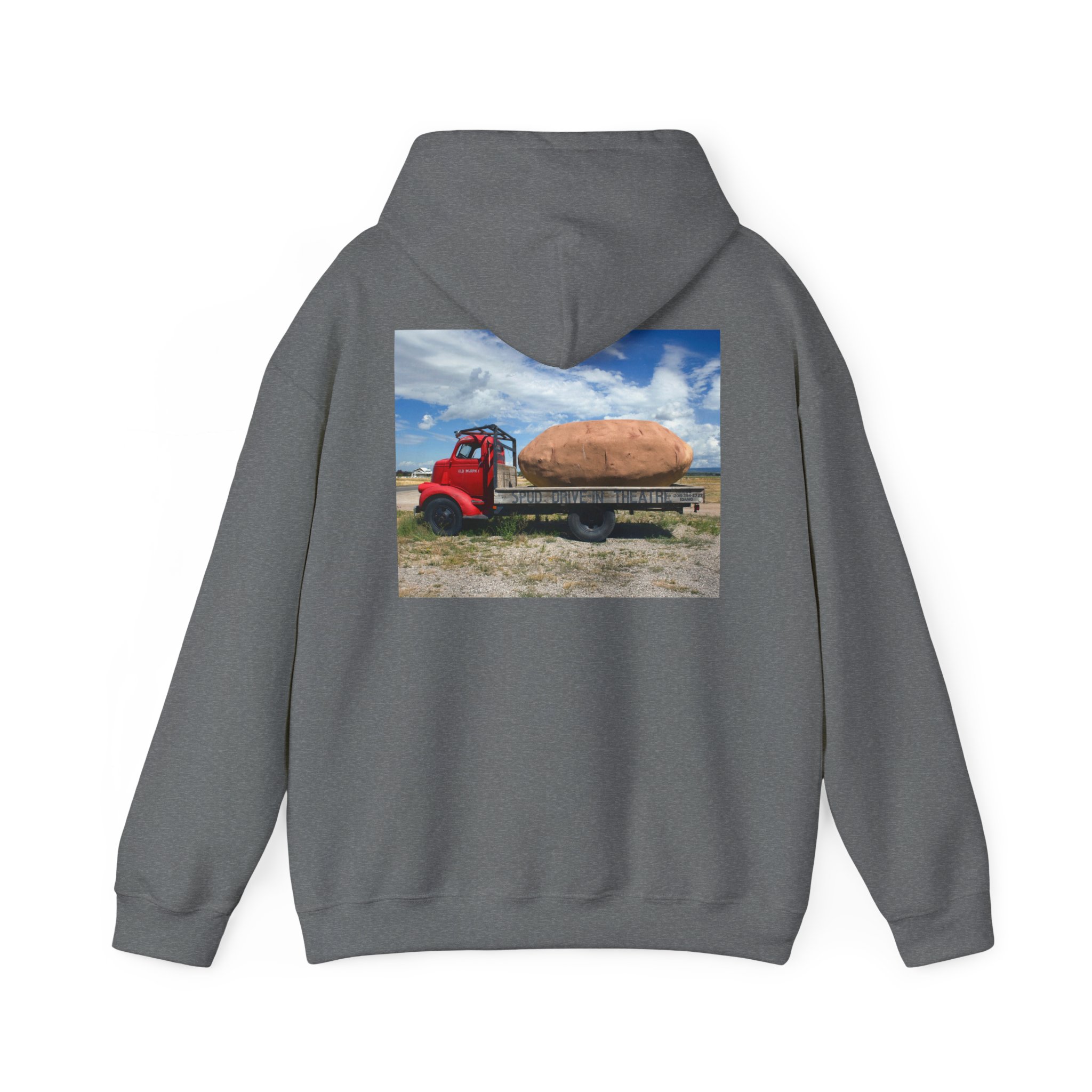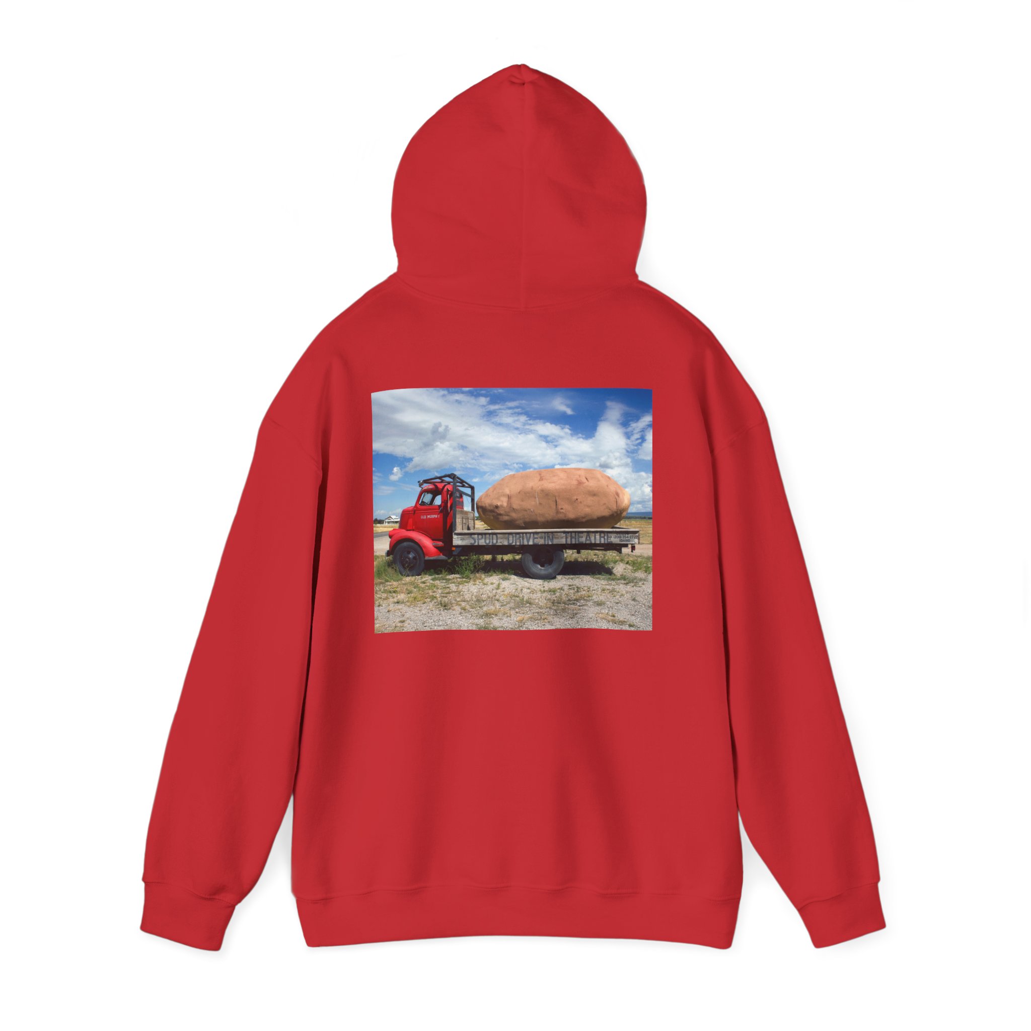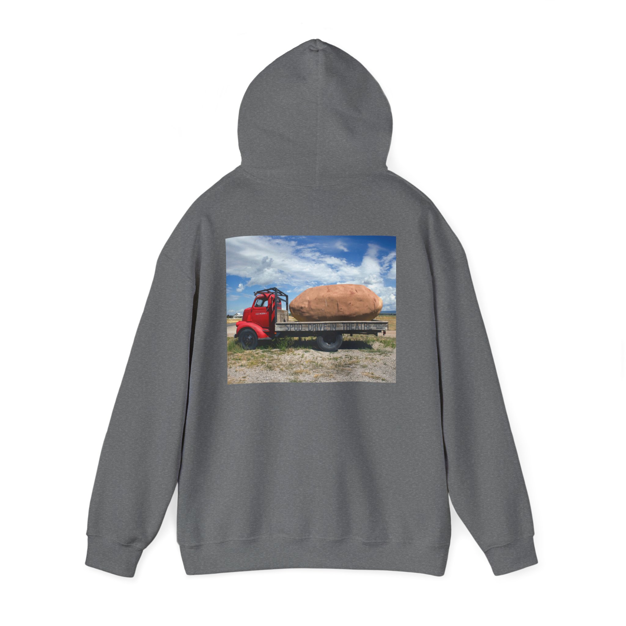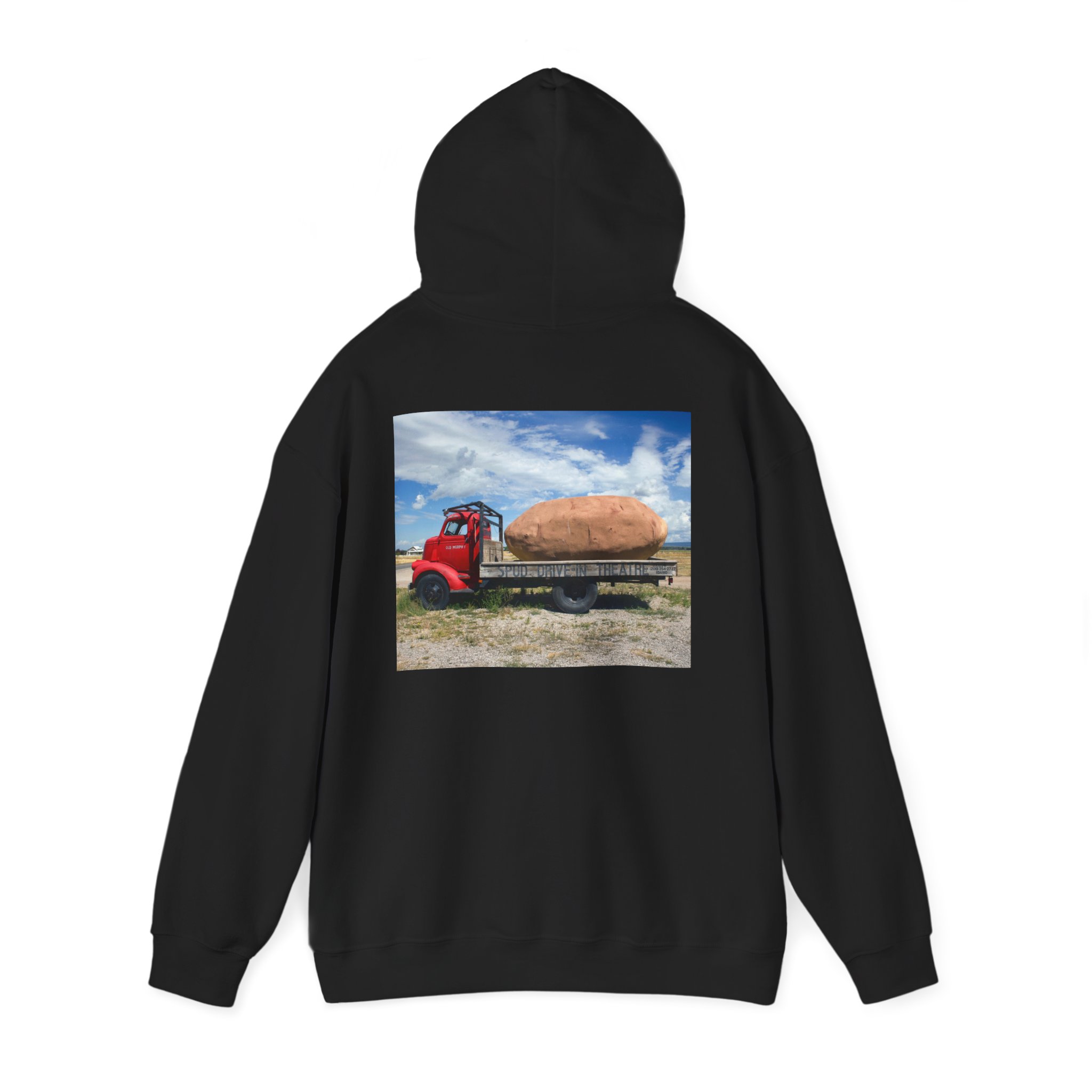 Stay warm and cozy in this Unisex Heavy Blend™ Hooded Sweatshirt featuring a giant potato on a truck in Idaho back printed design. Perfect for potato lovers and those who enjoy quirky and unique apparel. Ideal for casual wear, lounging at home, or as a statement piece during holidays and festivals.