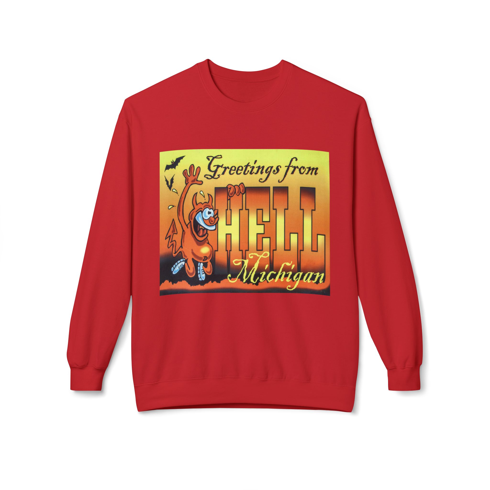 The Greetings From Hell crewneck sweatshirt is perfect for those who love retro vibes and road trips. The unisex fleece design gives a relaxed fit and feel, making it a versatile piece for everyday wear. Ideal for adults looking for a comfortable and stylish sweatshirt to wear during casual outings or cozy nights at home. Perfect for gifting on birthdays, holidays, or special occasions.