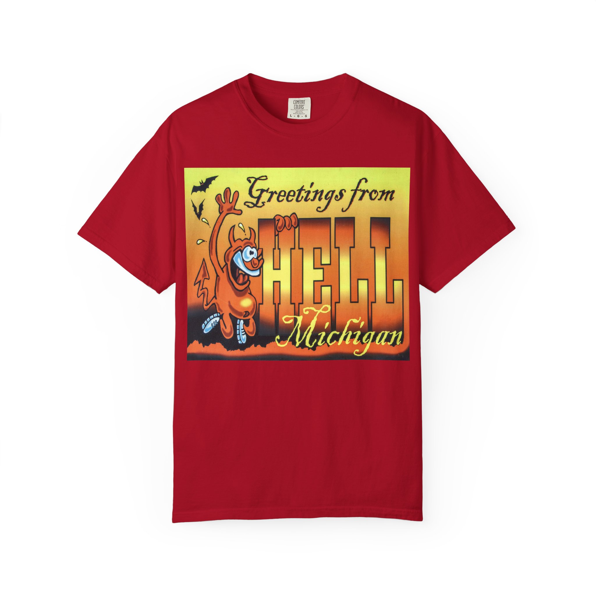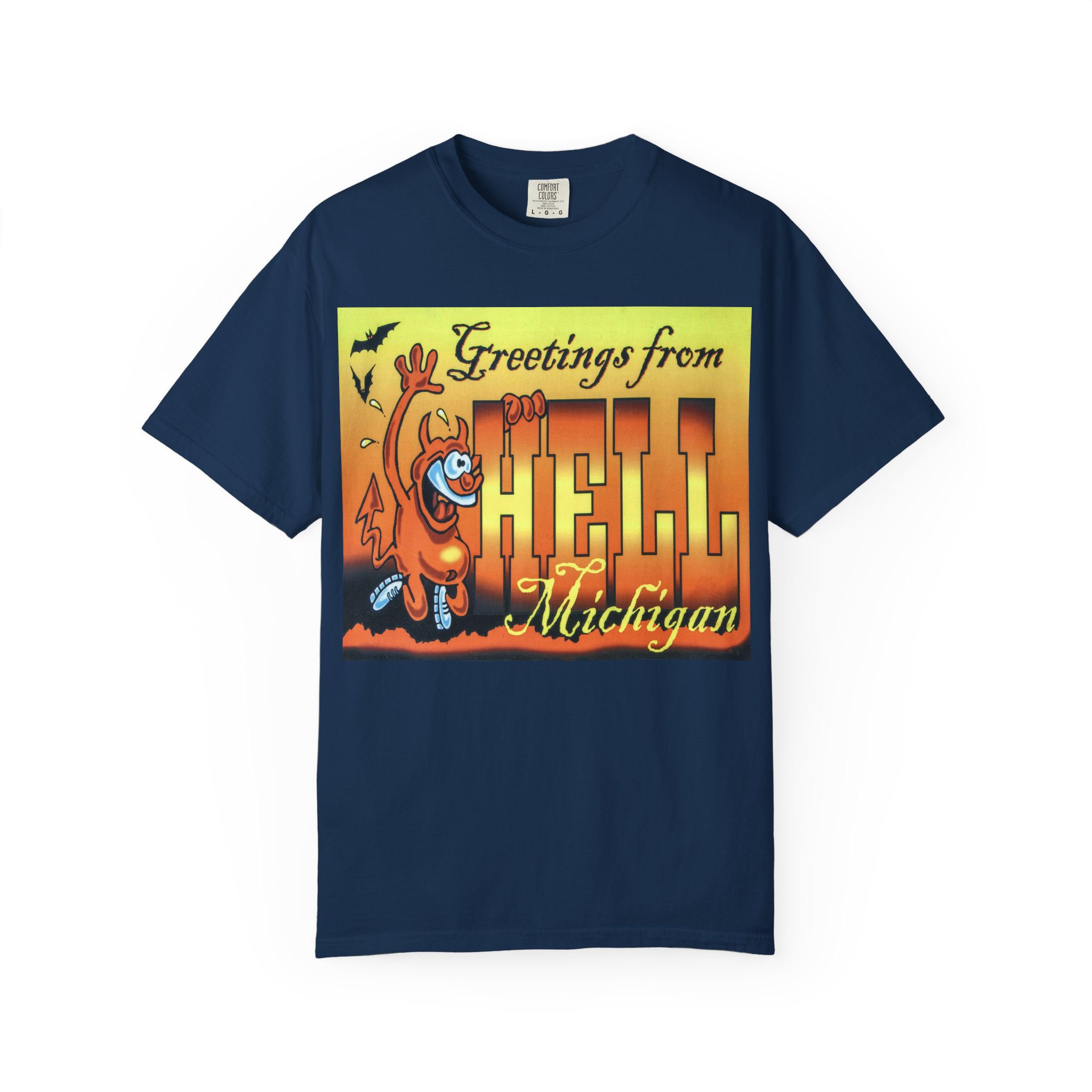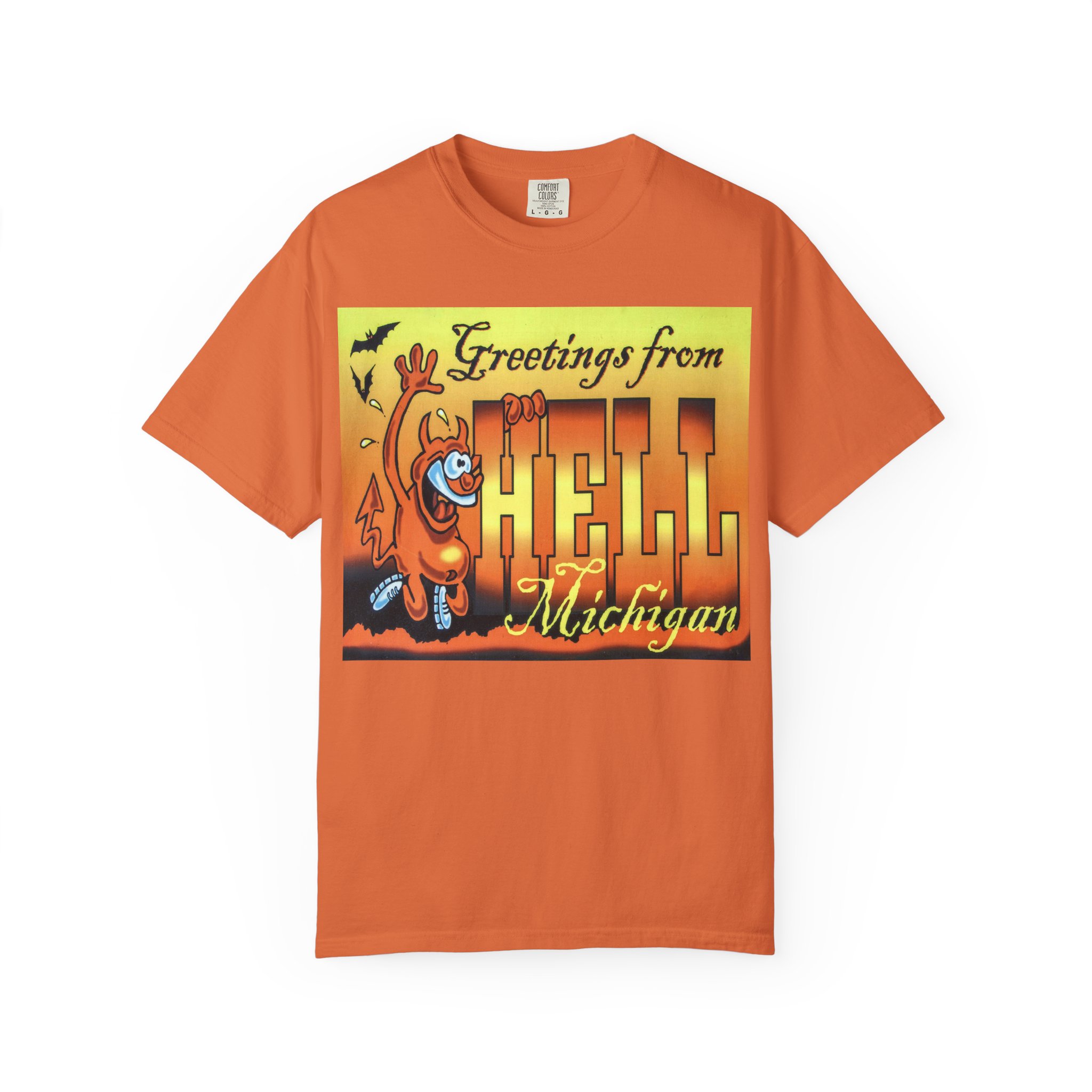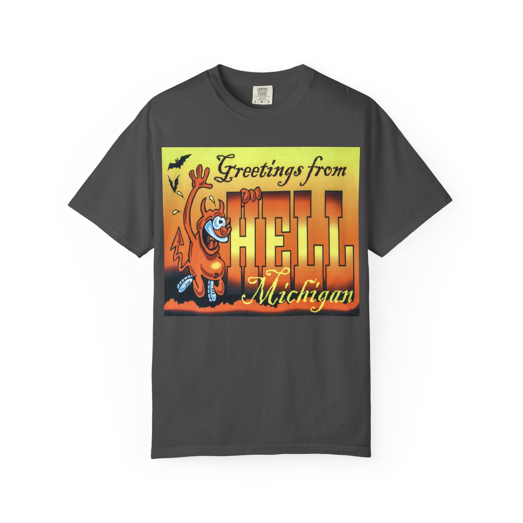 Be the first to review “Greetings from Hell Michigan Heavyweight T-shirt | Retro Sign Graphic”