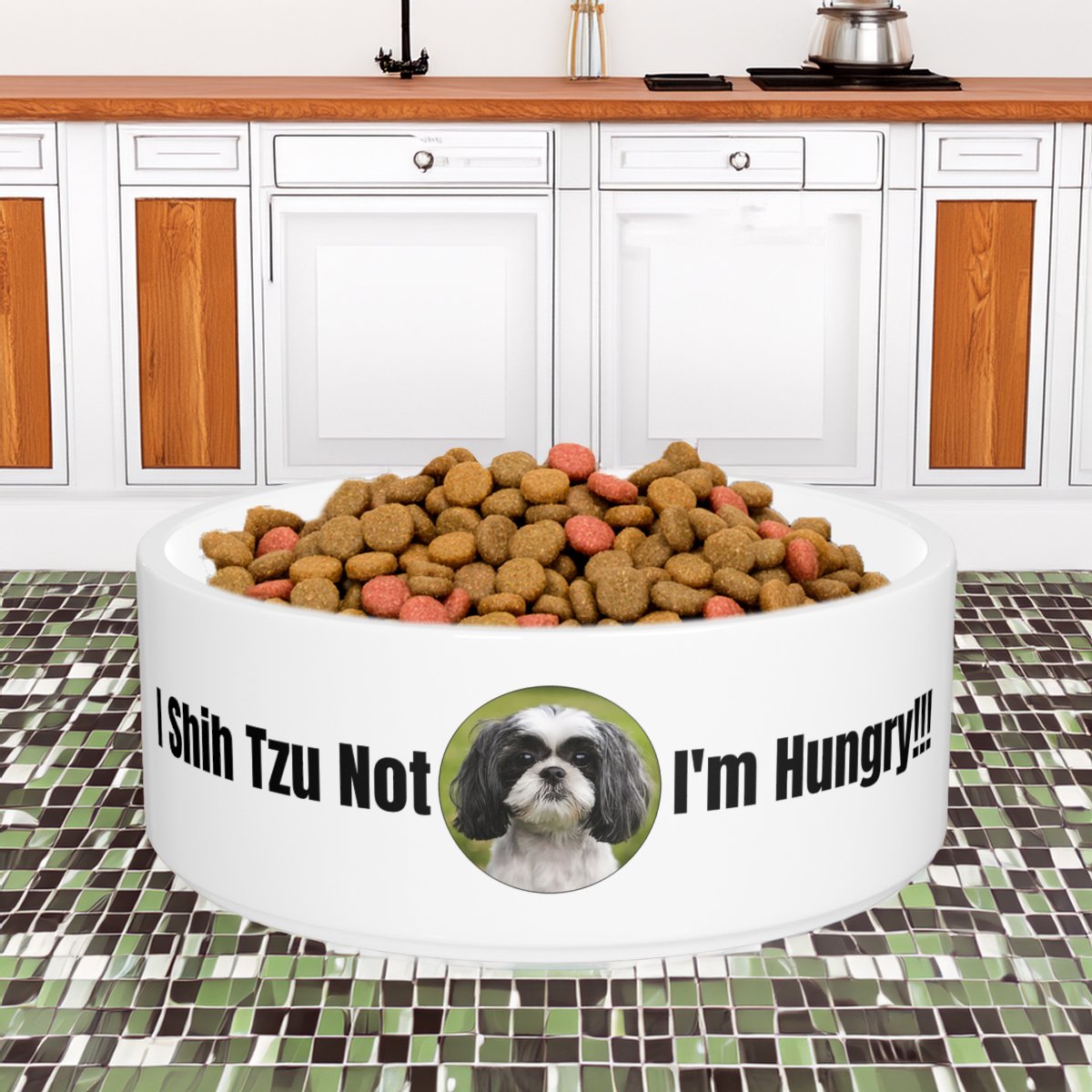 This ceramic pet bowl brings a playful wink to mealtime with its cheeky “I Shih Tzu Not I’m Hungry” design. Want your own dogs photo on the bowl let me know. The half-wrap print shows bright, detailed lettering that catches the eye and adds personality to your pup’s feeding spot. The glazed white ceramic gives a clean, glossy look that brightens any kitchen or pet corner. Durable and practical — it handles dishwasher and microwave use while keeping colors vivid. Sized for small breeds at 16 oz capacity and compact dimensions, it feels at home near cozy rugs, in apartment nooks, or beside crate setups. Use it when feeding, entertaining house guests with your pup’s charm, or swapping out a faded old bowl — it brings a little humor and polish to everyday routines.