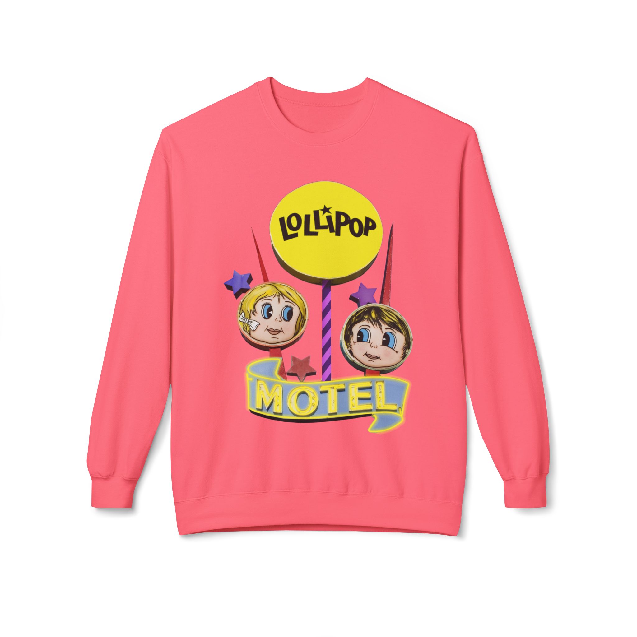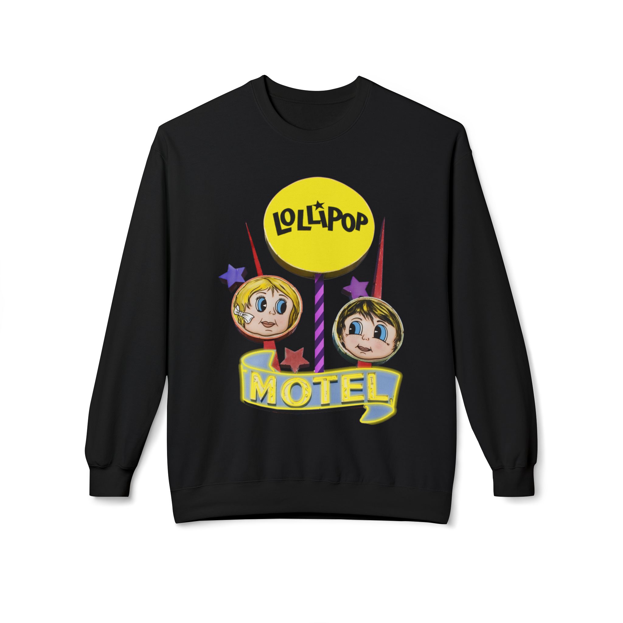 Lollipop Motel crewneck sweatshirt is perfect for those who love retro vibes and road trips. The unisex fleece design gives a relaxed fit and feel, making it a versatile piece for everyday wear. Ideal for adults looking for a comfortable and stylish sweatshirt to wear during casual outings or cozy nights at home. Perfect for gifting on birthdays, holidays, or special occasions.