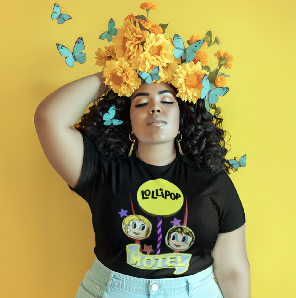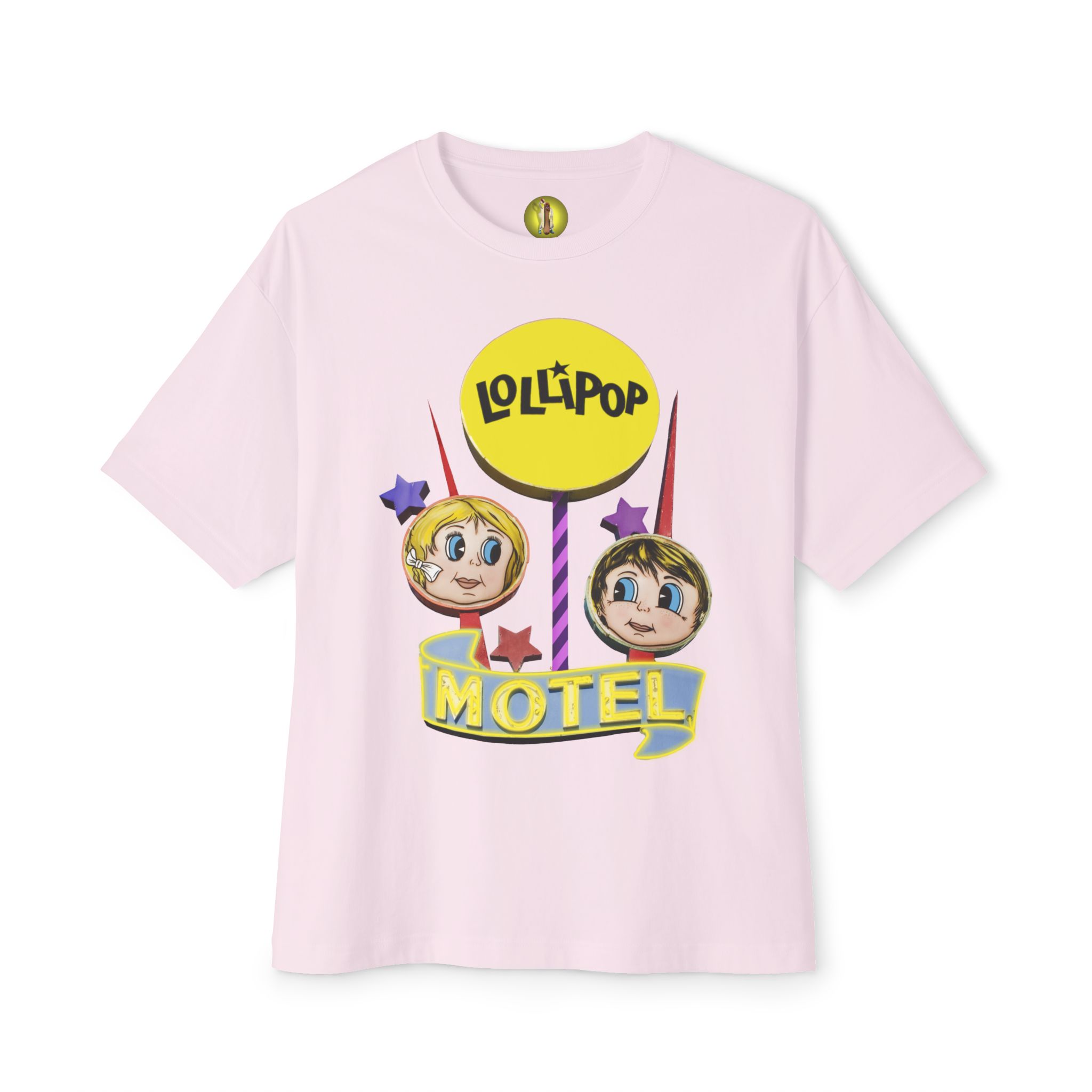 Vintage neon sign unisex oversized T-shirt inspired by Lollipop Motel in Wildwood NJ. Perfect for retro lovers and those nostalgic for classic roadside Americana. Ideal for casual outings and beach days. Great for fans of vintage signage and collectors of unique tees. Perfect for summer vacations and beach trips.