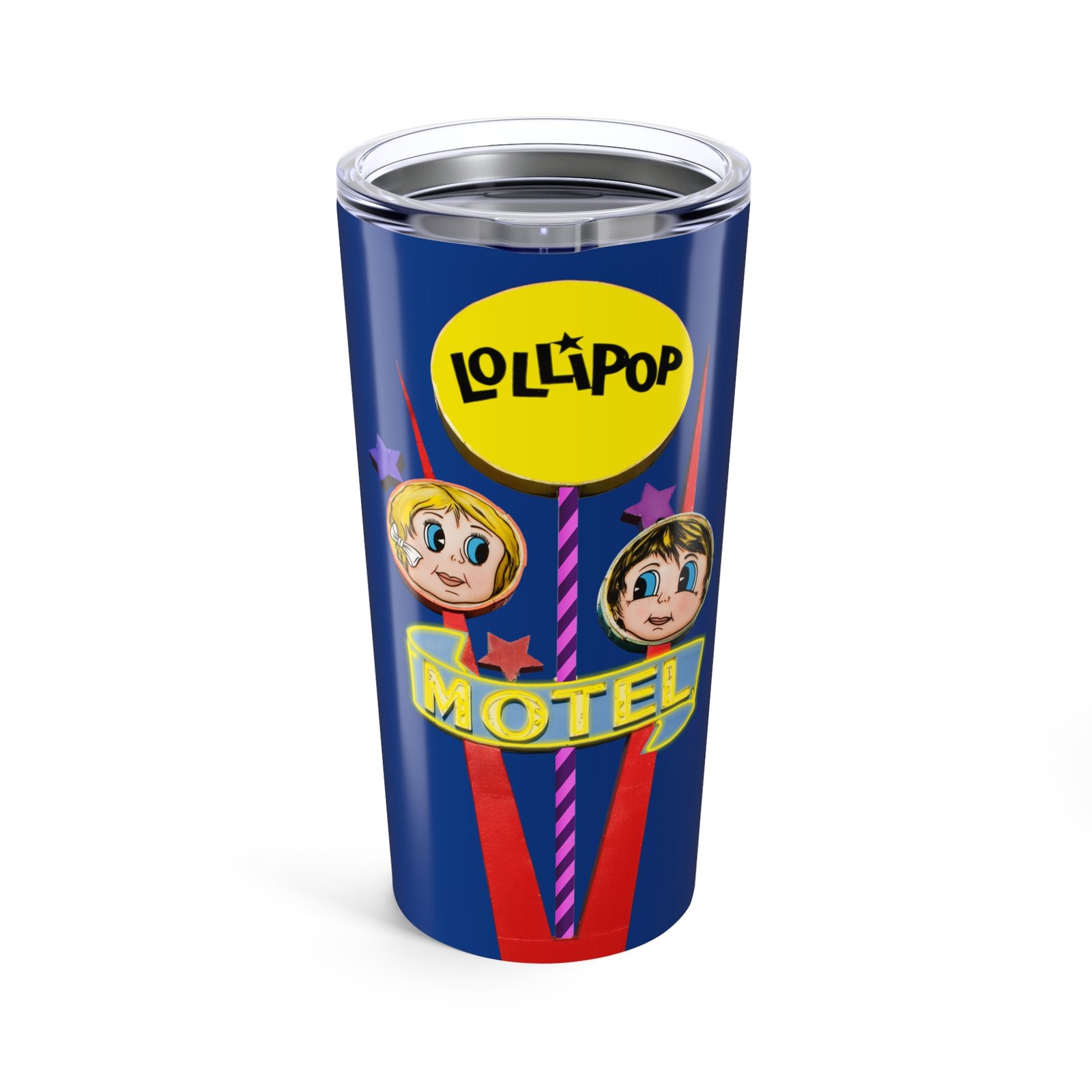 Retro Tumbler 20oz – Lollipop Motel Neon Sign for Road Trippers. This tumbler gives off a nostalgic vibe and is perfect for those who love road trips and vintage aesthetics. It is great for keeping beverages hot or cold while on the go, making it a must-have for travelers and outdoor enthusiasts. Ideal for gifting during summer vacations, holidays, and road trip adventures.
