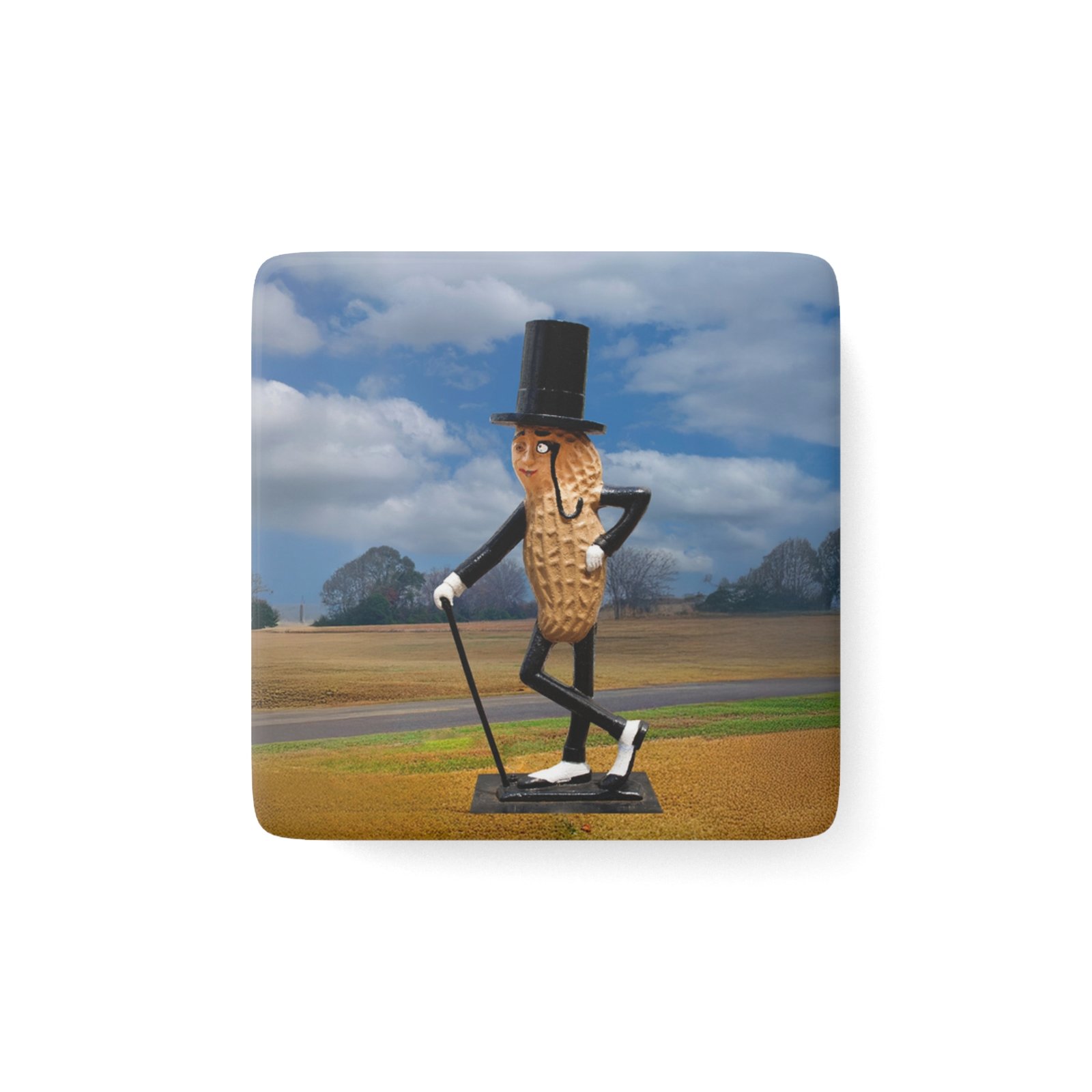 This 2″ porcelain magnet brings a slice of vintage diner charm to any magnetic surface. The square magnet features a Mister Peanut Statue rendered in bright, glossy colors that pop against the shiny porcelain. It feels nostalgic and playful—like a roadside billboard or a lunchbox sticker rolled into a small, tangible keepsake. Stick it to a fridge, locker, or workspace to add a bit of kitschy humor and bold color to daily life. It sits low-profile but catches the eye, making ordinary moments feel a little more fun and distinctly retro.
