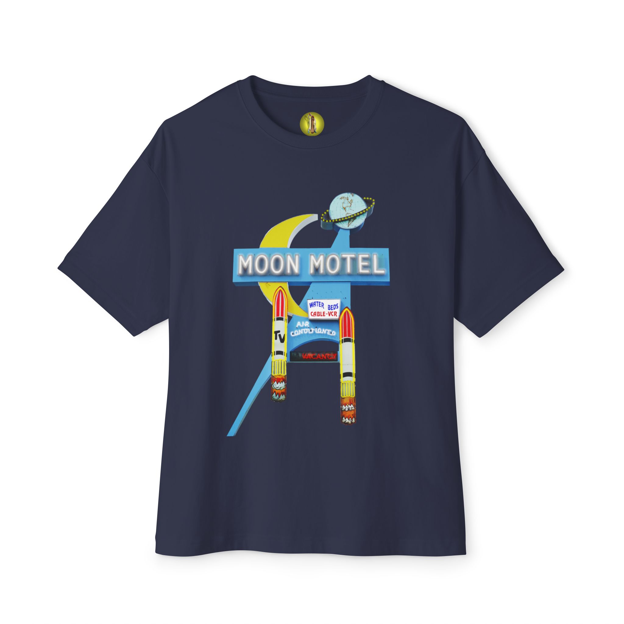 Vintage neon sign unisex oversized T-shirt featuring a Moon Motel in New Jersey design. This shirt gives off a retro vibe and is perfect for those who love vintage aesthetics and casual street style. Ideal for nostalgic individuals or anyone looking to make a fashion statement. Great for retro-themed parties, casual outings, or everyday wear.
