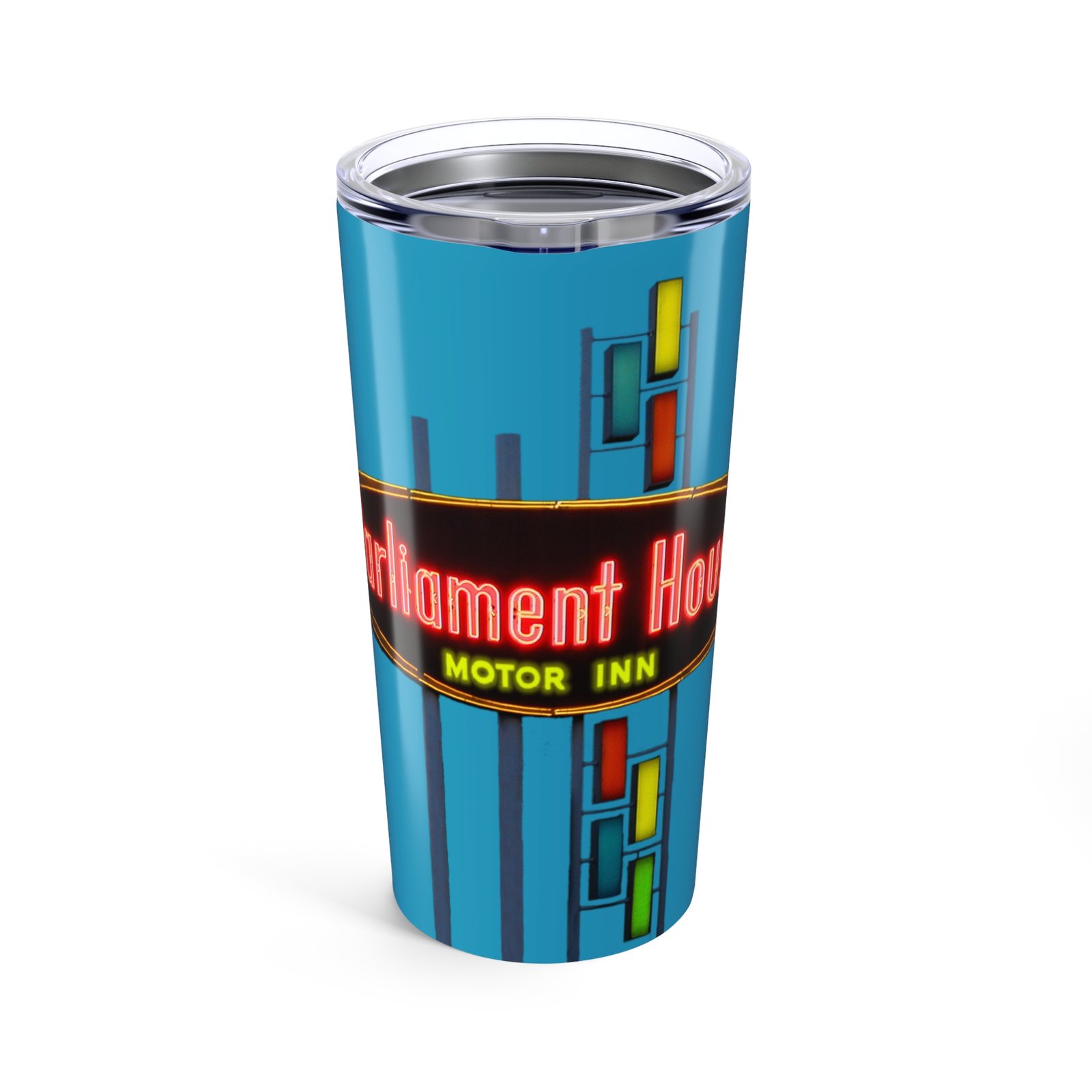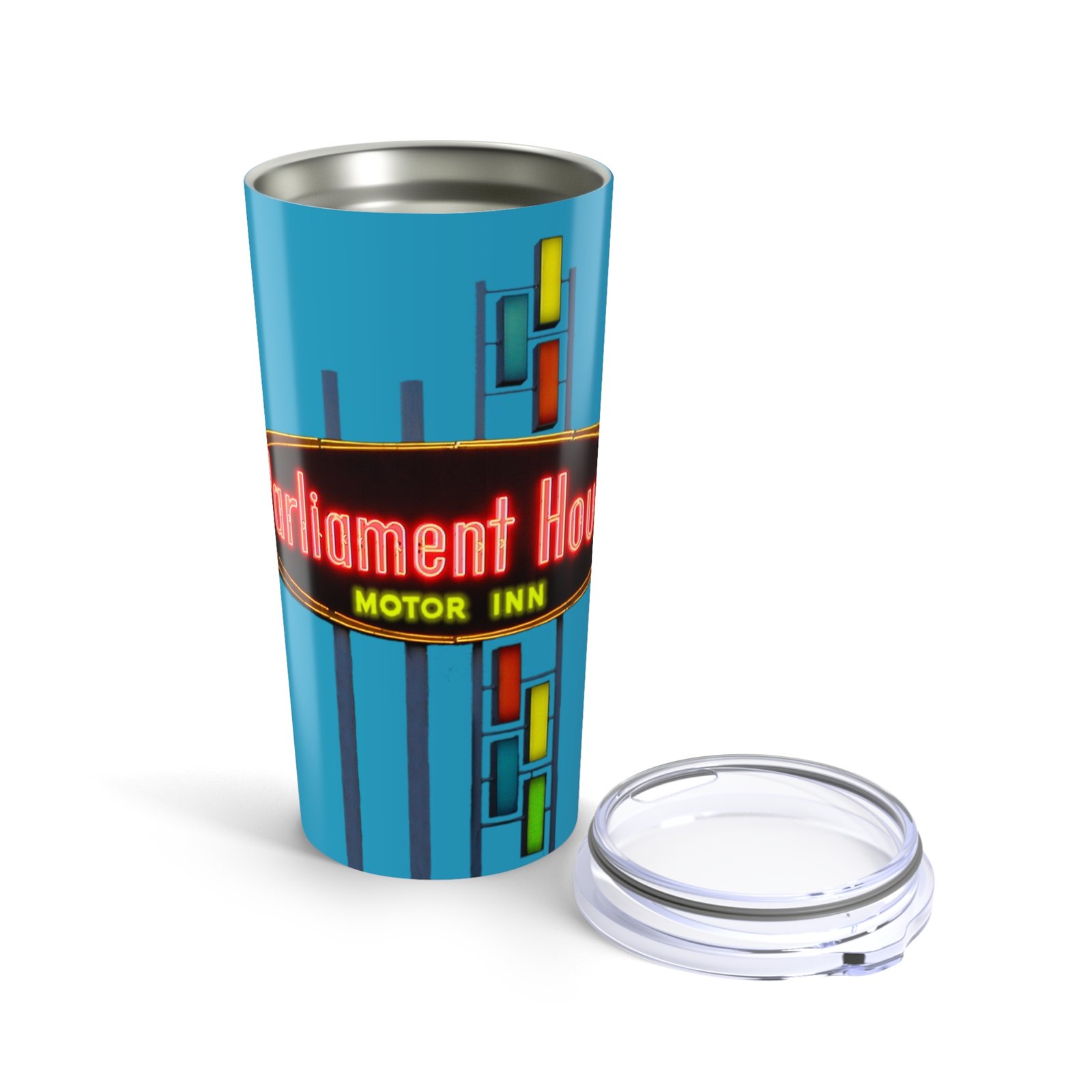 Retro Tumbler 20oz – Vintage Parliament House Neon Motel sign for Road Trippers. This tumbler gives off a nostalgic vibe and is perfect for those who love road trips and vintage aesthetics. It is great for keeping beverages hot or cold while on the go, making it a must-have for travelers and outdoor enthusiasts. Ideal for gifting during summer vacations, holidays, and road trip adventures.