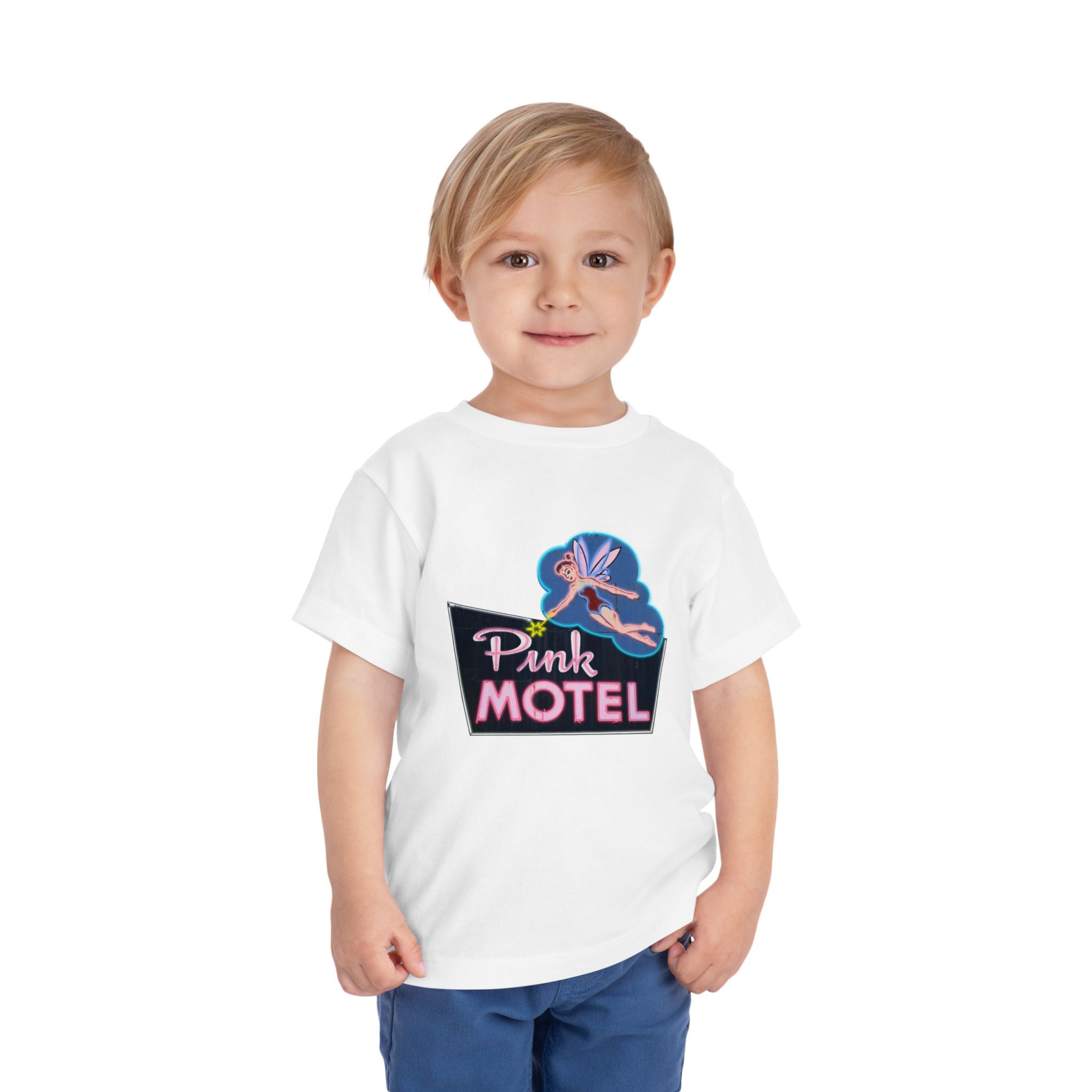 Pink Motel Toddler Tee, a playful graphic T-shirt perfect for kids. This short sleeve top is light and comfortable, ideal for everyday wear or playtime. It is relevant for parents looking for a fun and unique shirt for their toddlers, perfect for casual outings, playdates, or themed parties.
