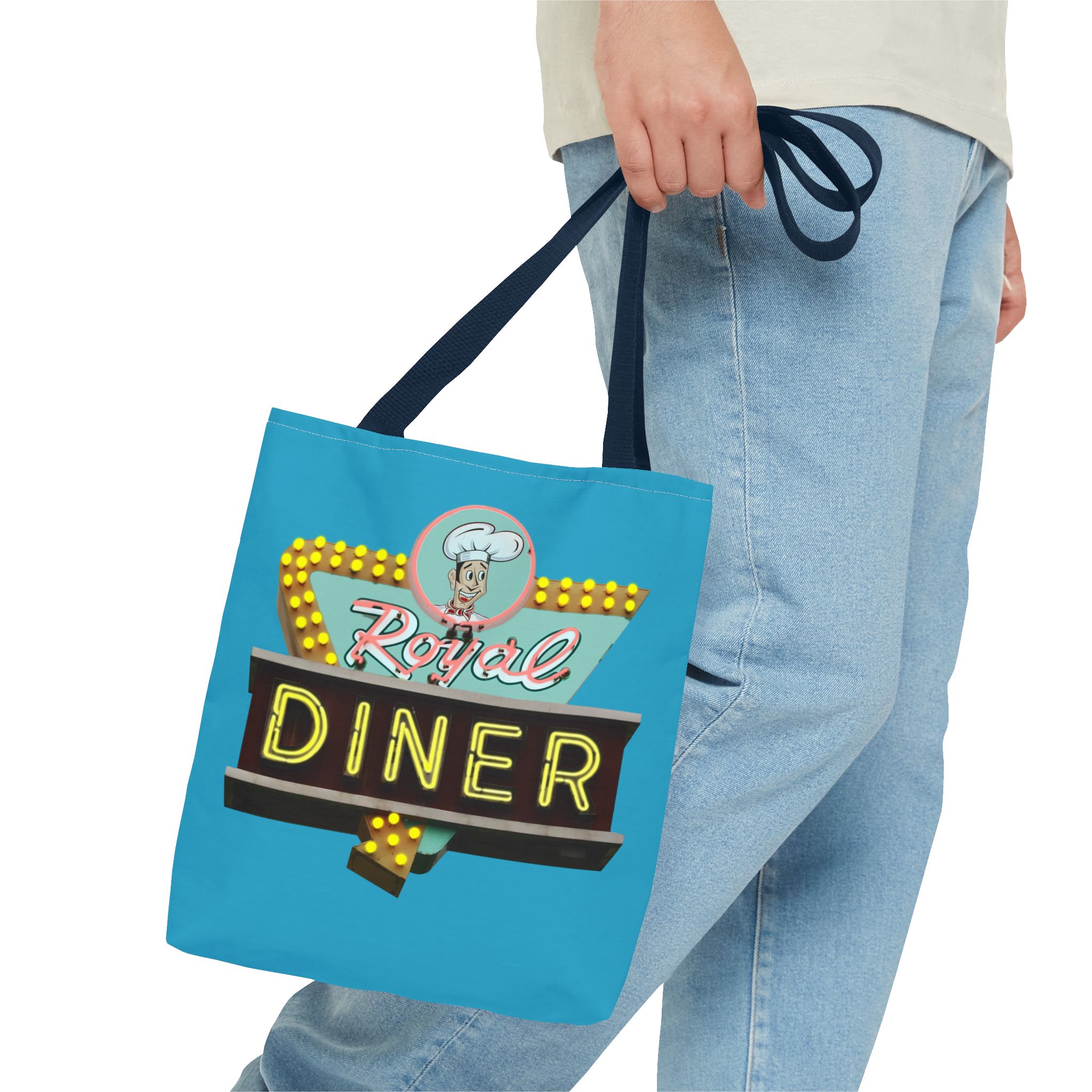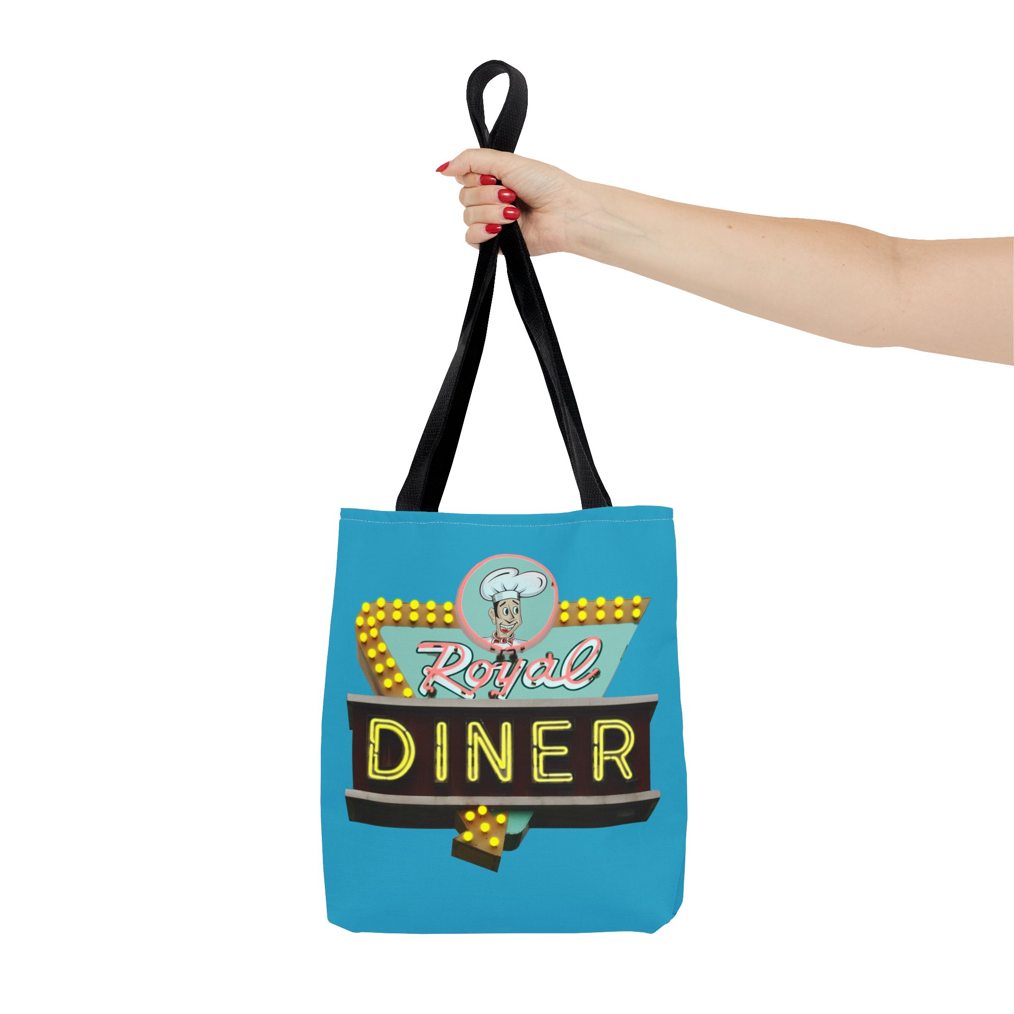 This trendy tote bag features a Royal Diner sign design, giving off a nostalgic and retro vibe. Perfect for those who love vintage aesthetics and want to add a unique touch to their everyday style. Ideal for anyone looking for a statement piece to carry their essentials in. Great for gifting during holidays and special occasions.