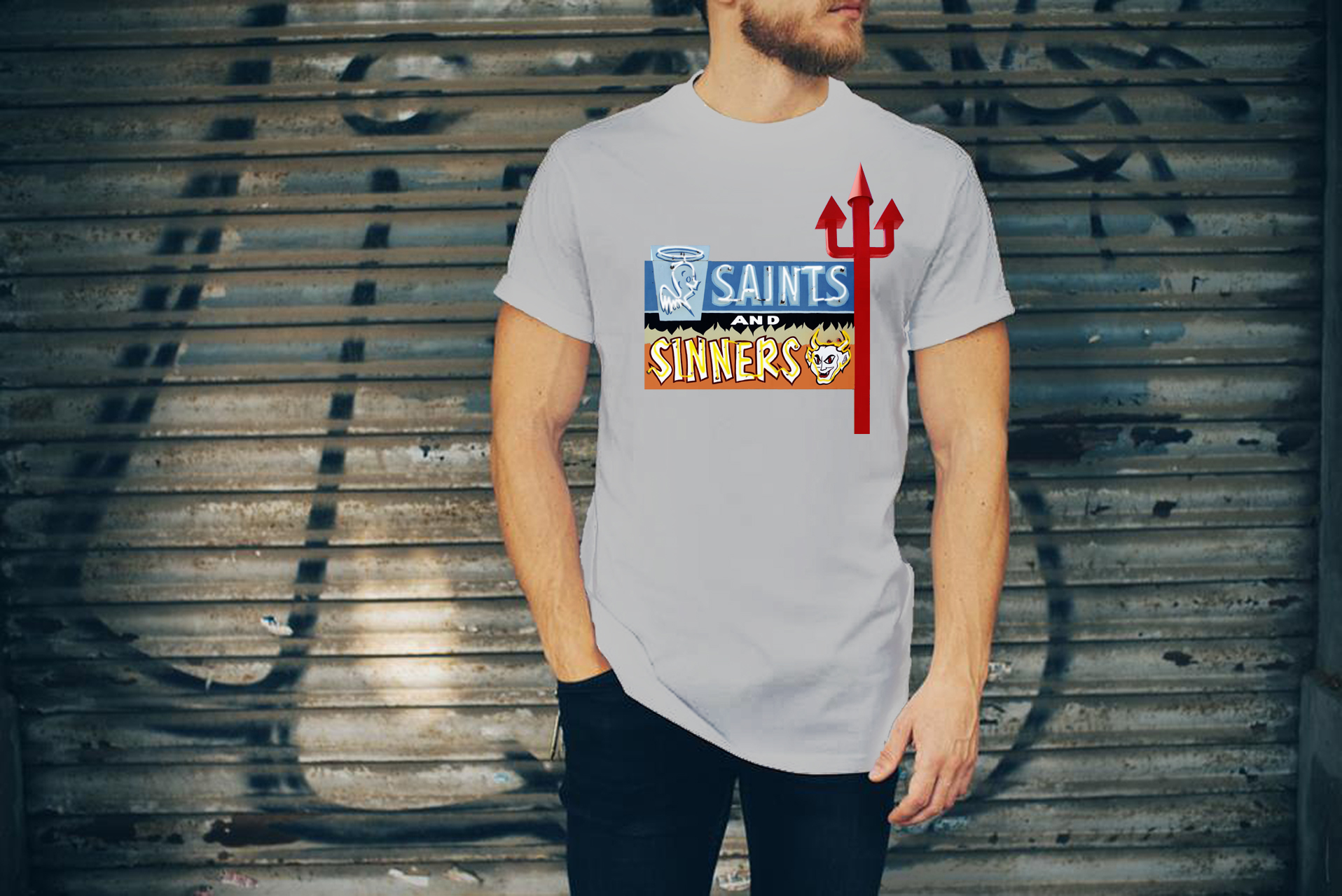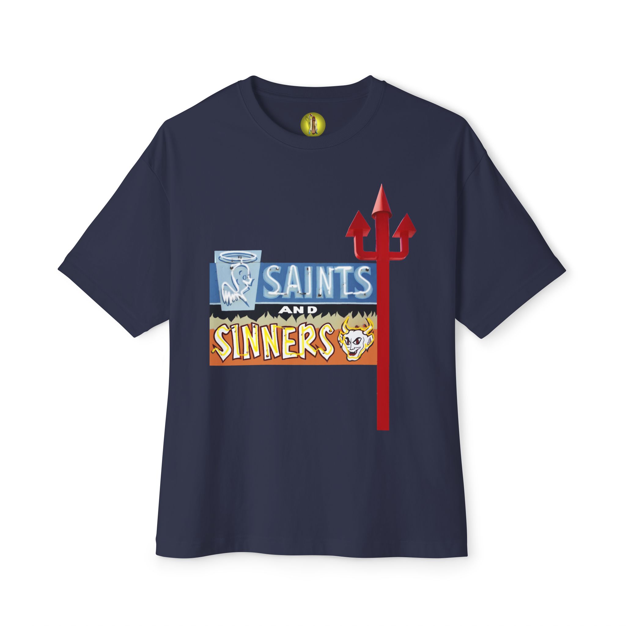 Vintage neon sign unisex oversized T-shirt inspired by Saints and Sinners in New Mexico. Perfect for retro lovers and those nostalgic for classic roadside Americana. Ideal for casual outings and beach days. Great for fans of vintage signage and collectors of unique tees. Perfect for summer vacations and beach trips.