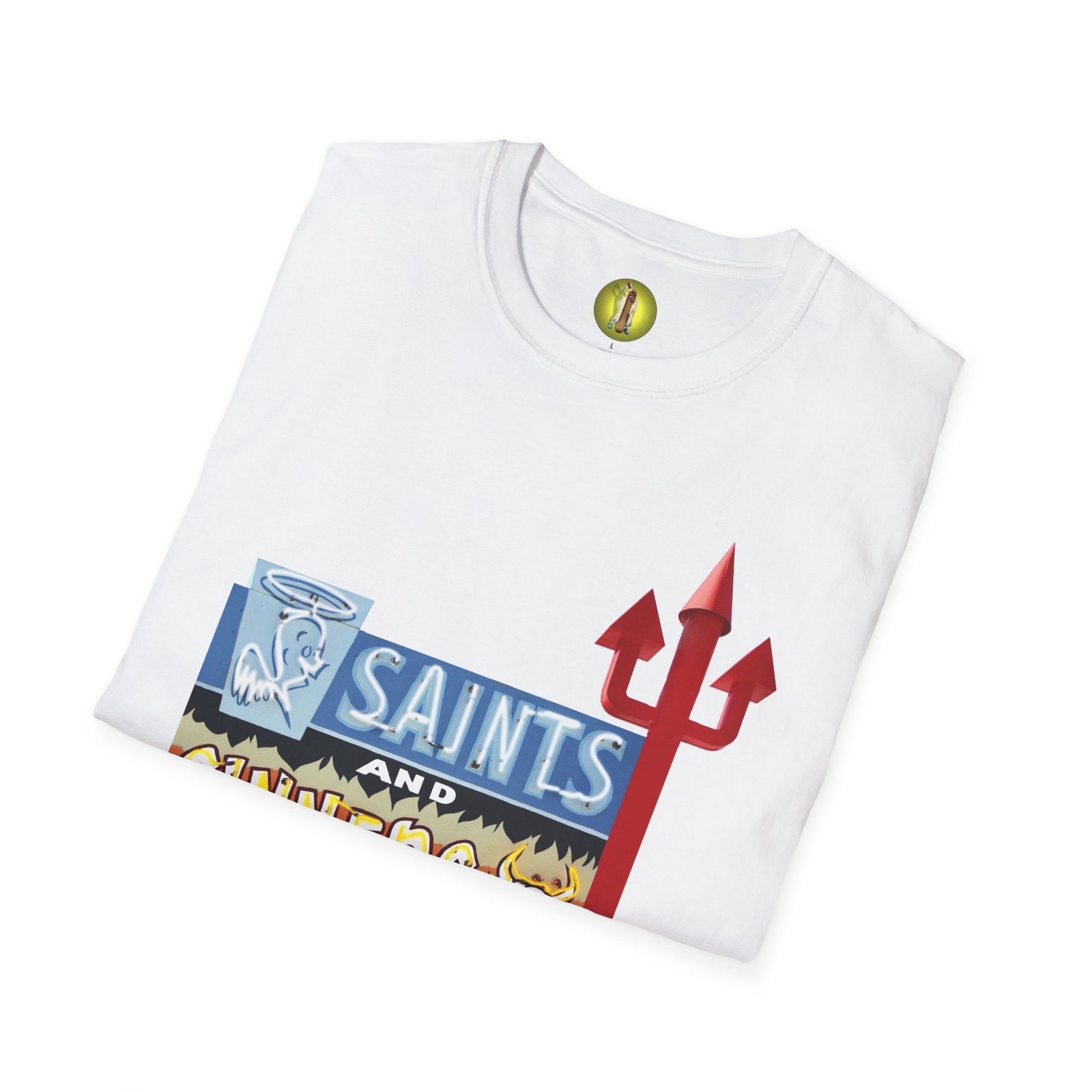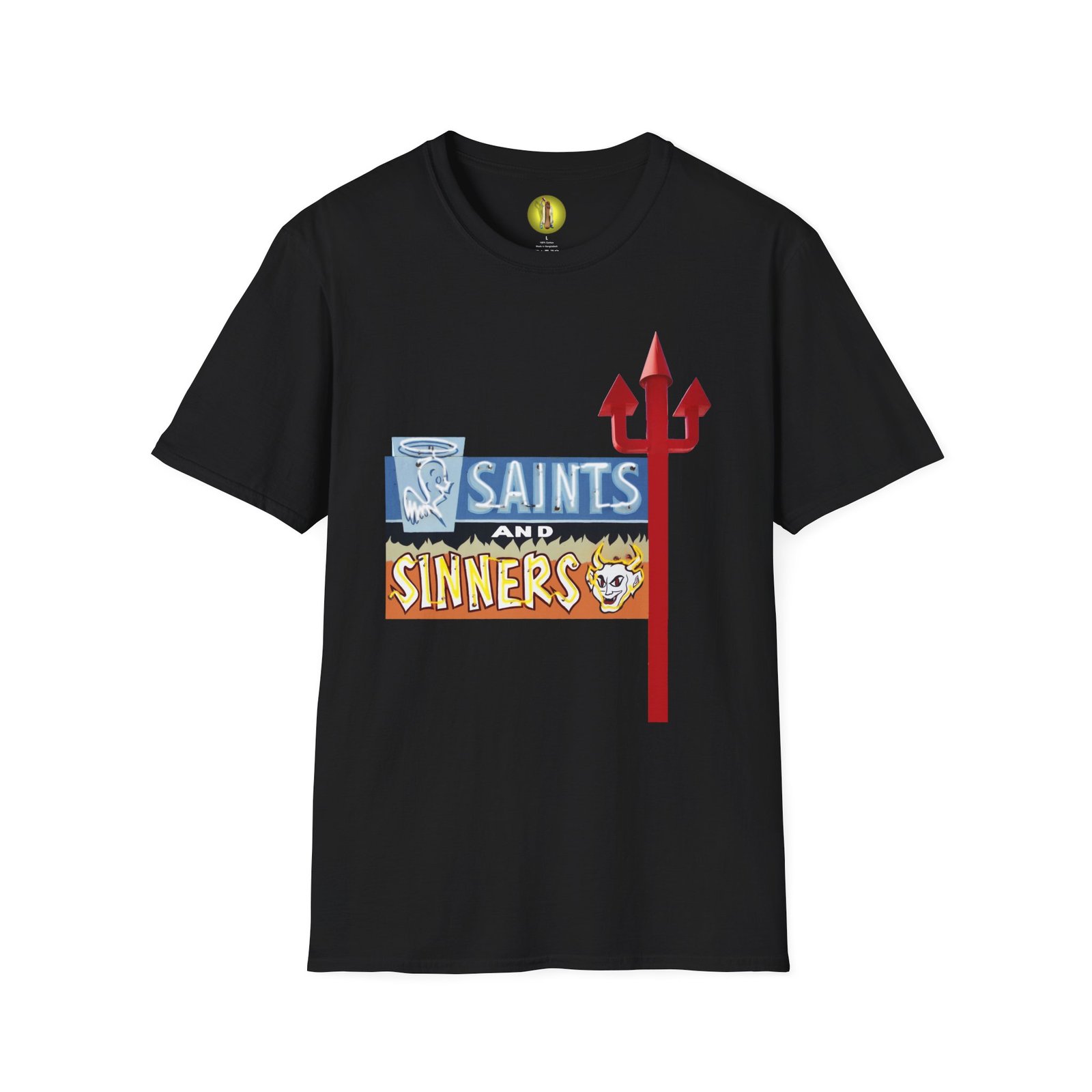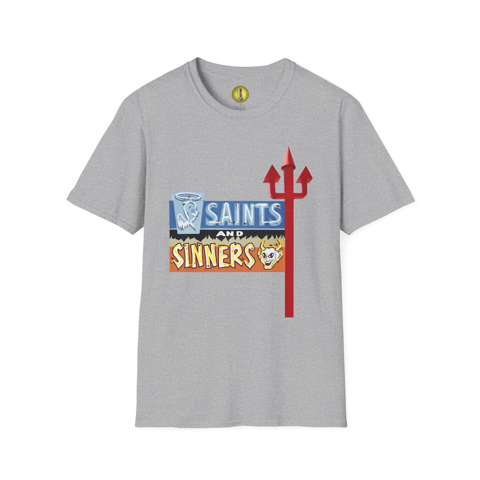 Vintage neon sign unisex softstyle T-shirt inspired by Saints and Sinners in New Mexico. This T-shirt exudes a retro vibe and can be easily styled with any casual outfit. Perfect for adults looking for a unique and eye-catching piece to wear during street festivals, concerts, and casual hangouts.