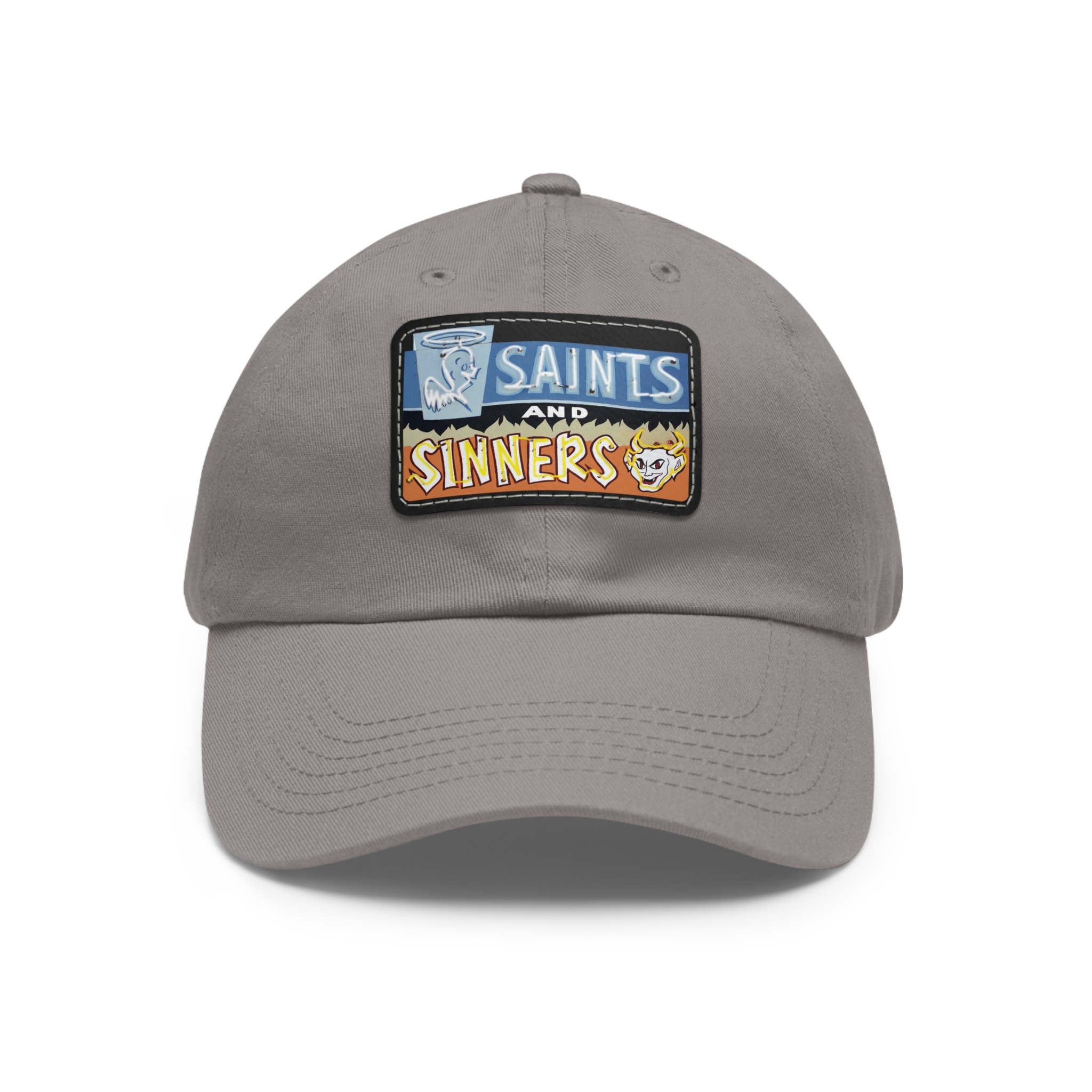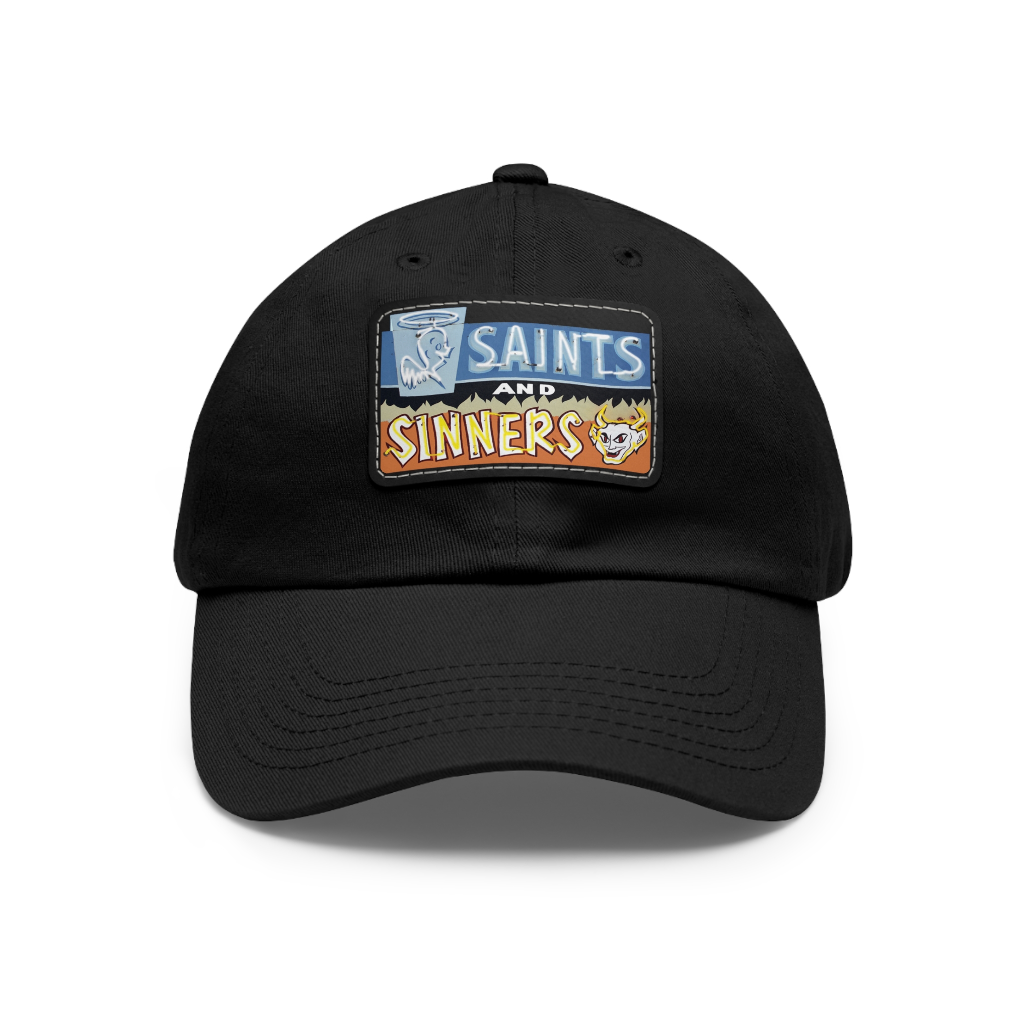 Stylish hat with leather patch featuring Saints & Sinners design, perfect for adding a trendy touch to any outfit. Ideal for fashion-forward individuals looking to make a statement. Relevant for Father’s Day, birthdays, and everyday casual wear.