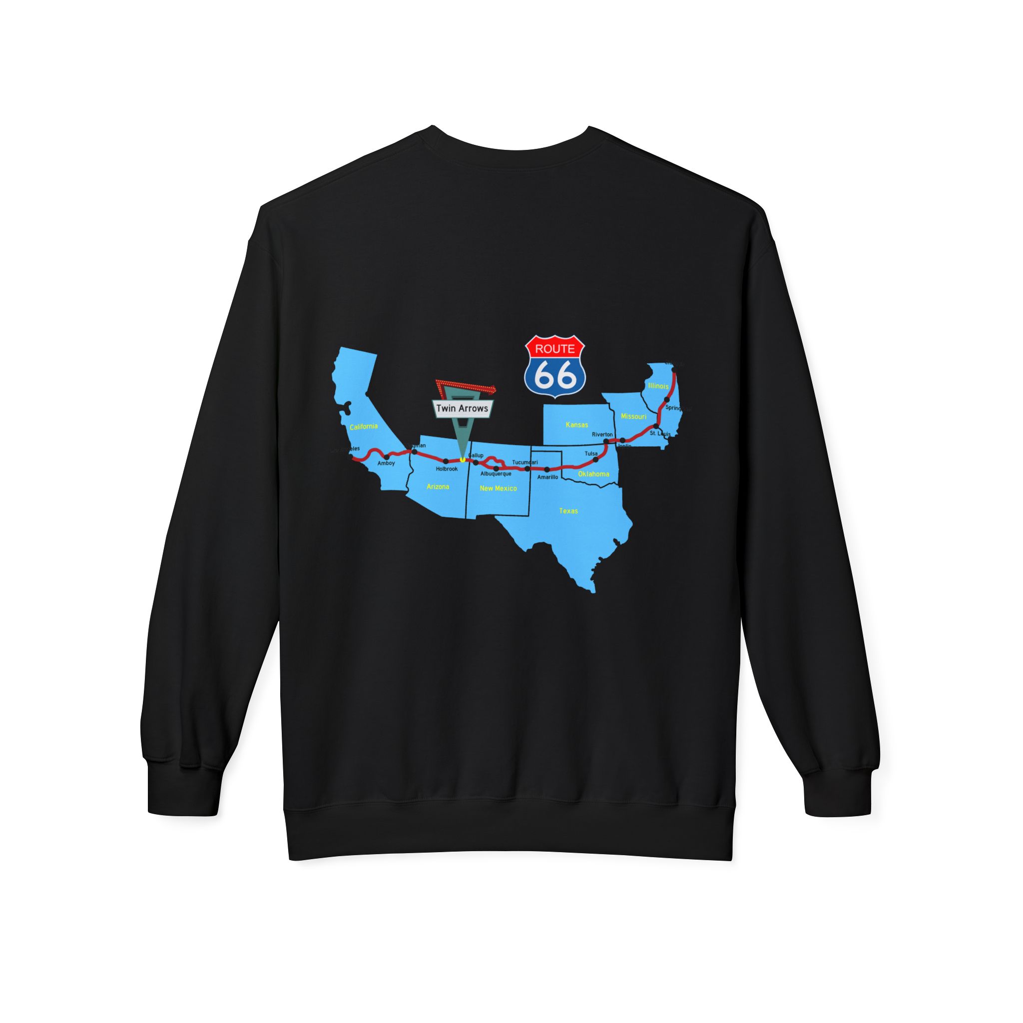 Vintage route 66 crewneck sweatshirt with images on both sides, giving off a retro and nostalgic vibe. Perfect for those who love Americana and vintage styles, ideal for casual wear or a cozy day at home. Great for fans of road trips, history, and retro fashion. Suitable for holidays like Christmas or birthdays for retro enthusiasts.